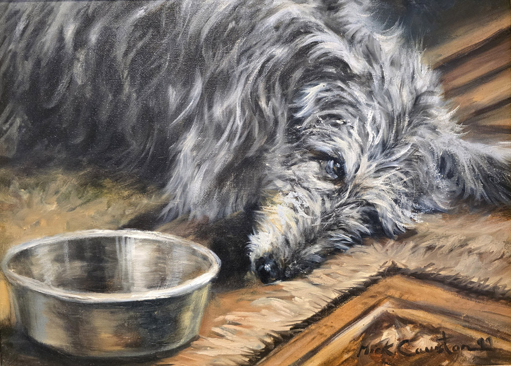 The decade that Mick spent living on Exmoor was as impactful on the iconography and identity of the area in the late 20th and early 21st century as Sir Alfred Munnings’ efforts fifty or so years earlier. Many people have their own anecdotes of Mick; from drawing their dog’s portrait on a napkin, painting the sign for their farm or a raucous night in a local wateringhole – Mick has attained near mythical status in North Devon and West Somerset. I once asked someone how it was that Mick was able to transcend his craft – they replied, ‘he was a sweetheart’.