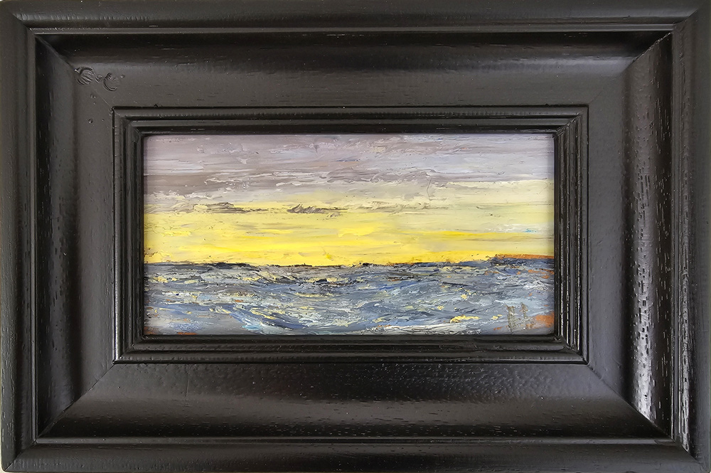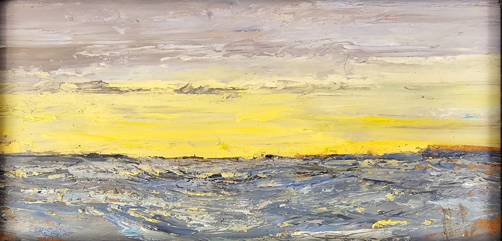 Working mainly in oils on unprepared MDF board – often applying paint with a palette-knife – Hammick builds up layers of colour with a confident, intuitive touch. He embraces the unpredictable, allowing each piece to evolve naturally. Many of his paintings are small in scale, designed to invite private contemplation, offering what the artist describes as ‘straightforward attempts to encompass broad horizons in small frames.’