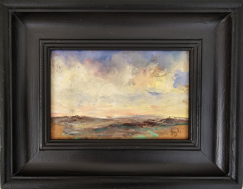 Working mainly in oils on unprepared MDF board – often applying paint with a palette-knife – Hammick builds up layers of colour with a confident, intuitive touch. He embraces the unpredictable, allowing each piece to evolve naturally. Many of his paintings are small in scale, designed to invite private contemplation, offering what the artist describes as ‘straightforward attempts to encompass broad horizons in small frames.’