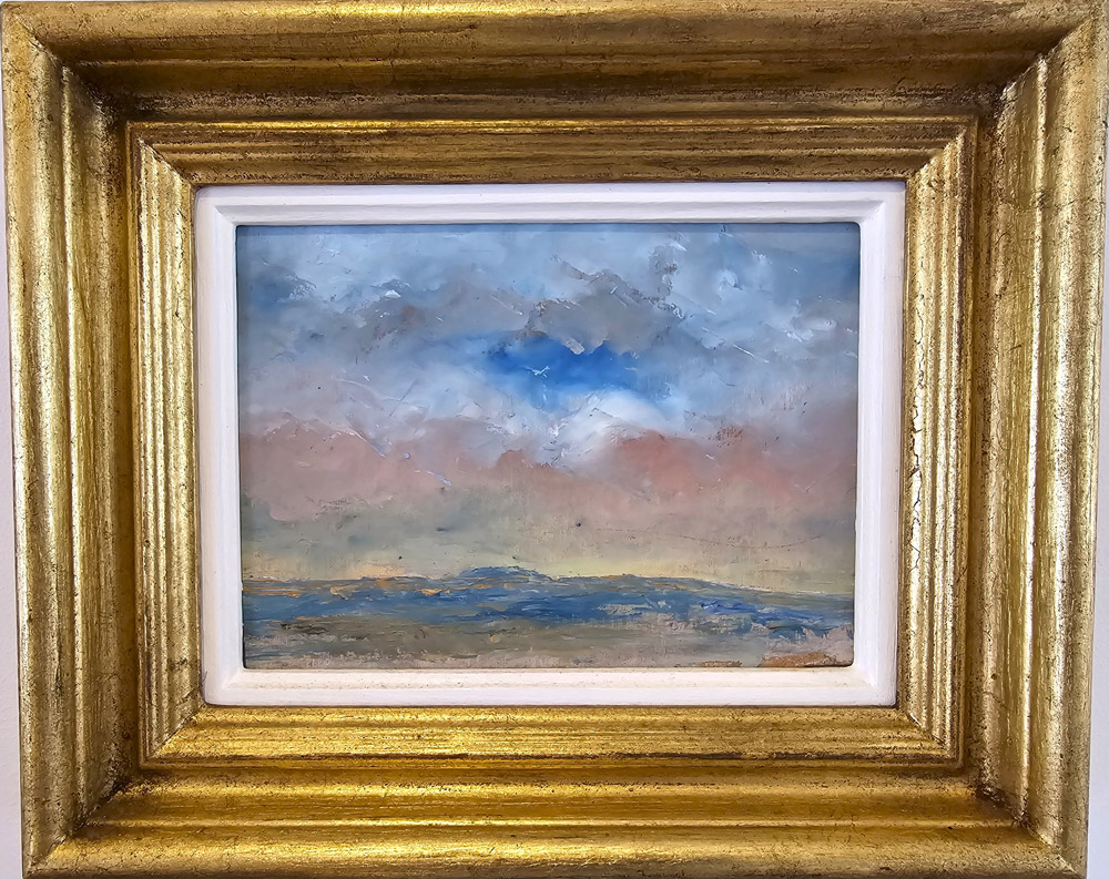 Working mainly in oils on unprepared MDF board – often applying paint with a palette-knife – Hammick builds up layers of colour with a confident, intuitive touch. He embraces the unpredictable, allowing each piece to evolve naturally. Many of his paintings are small in scale, designed to invite private contemplation, offering what the artist describes as ‘straightforward attempts to encompass broad horizons in small frames.’