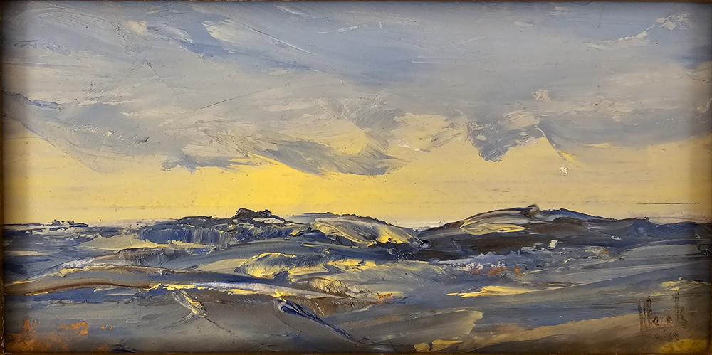 Working mainly in oils on unprepared MDF board – often applying paint with a palette-knife – Hammick builds up layers of colour with a confident, intuitive touch. He embraces the unpredictable, allowing each piece to evolve naturally. Many of his paintings are small in scale, designed to invite private contemplation, offering what the artist describes as ‘straightforward attempts to encompass broad horizons in small frames.’
