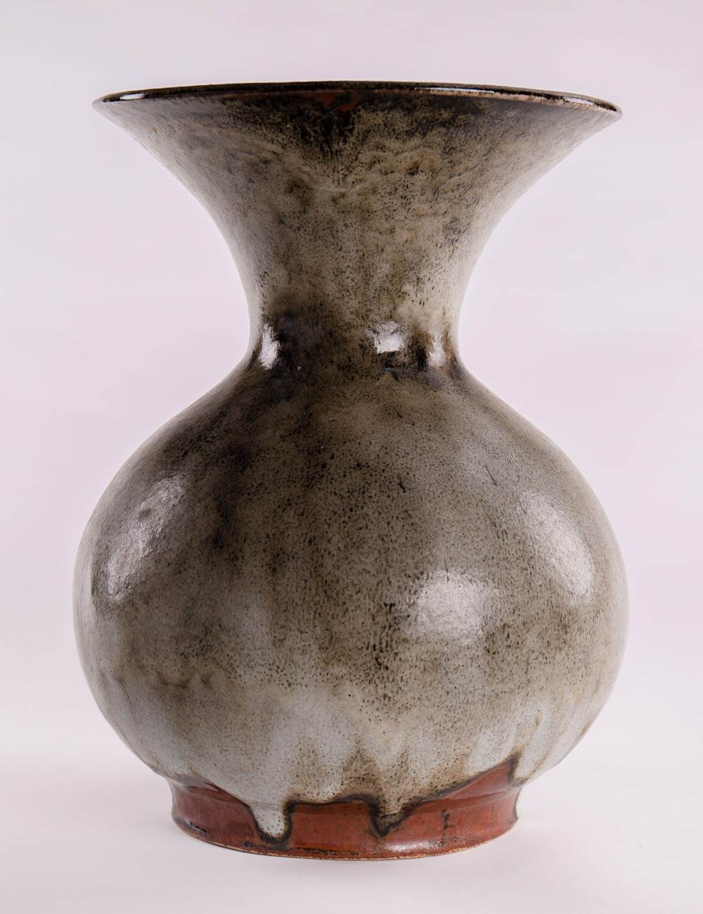 A monumental baluster stoneware vase with flared lip, satin dripware glaze in ash and blacks with manganese, signed to the base